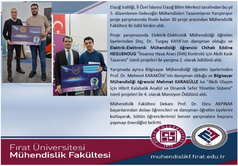 Elazığ Valiliği, İl Özel İdaresi Elazığ Bilim Merkezi tarafından bu yıl 5. düzenlenen Geleceğin Mühendisleri Tasarımlarını Yarıştırıyor proje yarışmasında finale kalan 30 proje arasından Mühendislik Fakültesi iki ödül birden aldı.